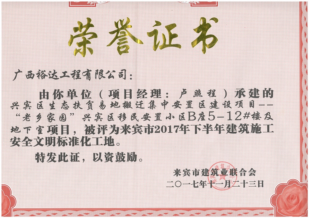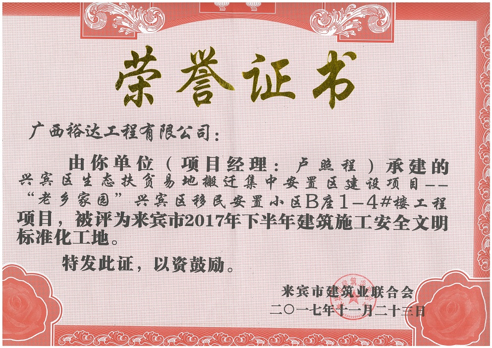近日,由开云集团有限公司承建的兴宾区生态扶贫易地搬迁集中安置区建设项目—“老乡家园”兴宾区移民安置小区B座1-4#楼、B座5-12#楼及地下室、裕达·金碧天誉A区1#-4#楼及地下室,共3个工地荣获来宾市2017年下半年“安全文明标准化工地”荣誉称号。