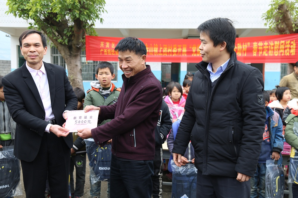 与兴宾区委办等一行在上团村小学捐赠教育基金及书包等学习用品