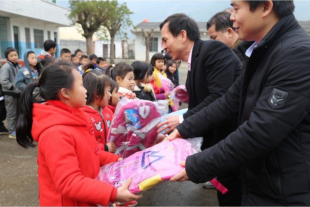 集团党支部书记谢家伟与兴宾区委办副主任杨杰为学生送去书包