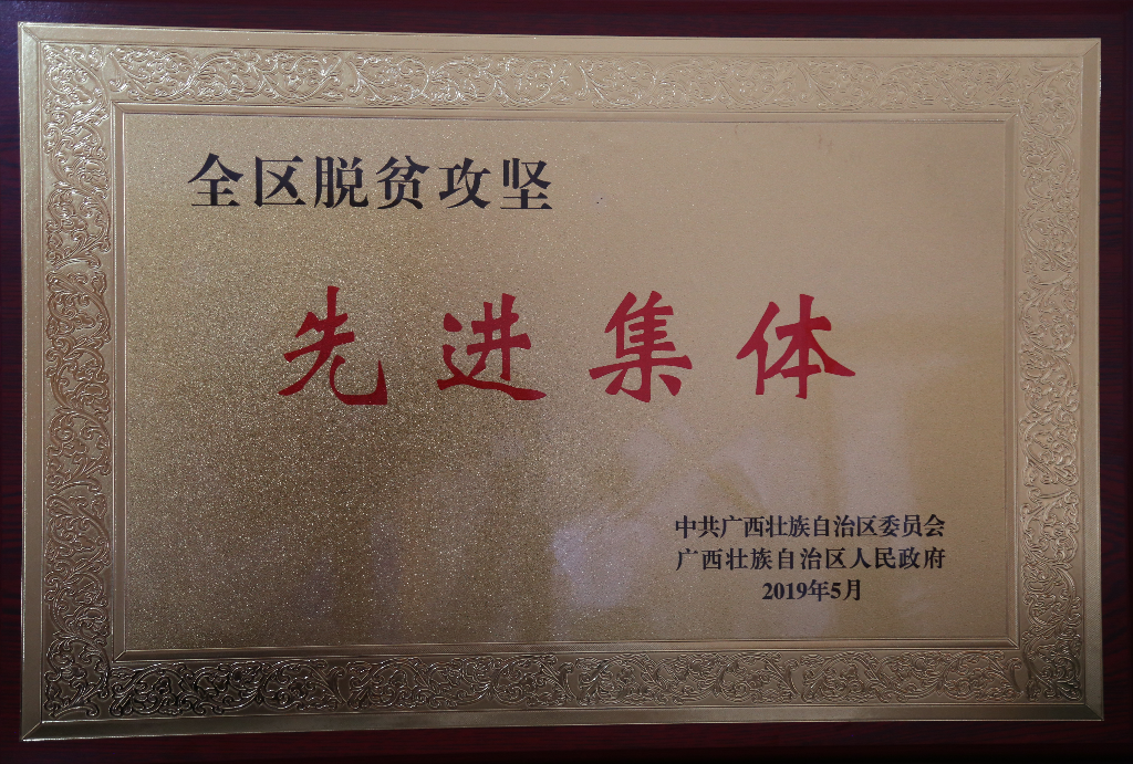 日前,广西壮族自治区人民政府以及中共广西壮族自治区办公厅印发了《关于表彰全区脱贫攻坚先进集体和先进个人的决定》,广西裕达集团有限公司以突出的社会贡献及良好的口碑被光荣授予“全区脱贫攻坚先进集体”荣誉称号。本次广西共表彰了全区脱贫攻坚先进集体100个、全区脱贫攻坚先进个人100人