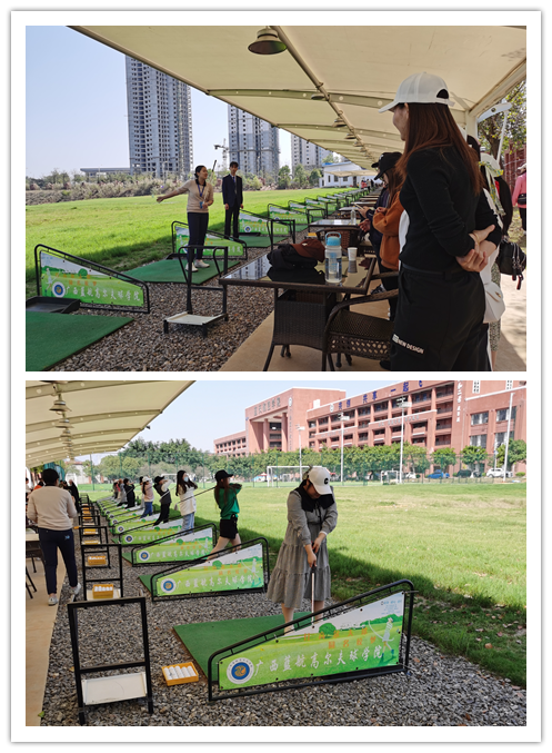 “双脚站平,腰背挺直,分“三点”走,目光注视高尔夫球…”,专业高尔夫教练从站姿、握杆、发力点等几大基础知识教女员工们入手,再经过教练的专业指导与动作矫正,大家渐渐有了专业高尔夫选手的姿态,“这个姿势漂亮”“力度到位”“收杆标准” ........这些赞美词不断的从教练口中说出。