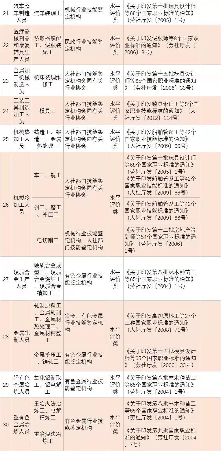 (四)深化技能人员职业资格制度改革。巩固职业资格改革成果,完善国家职业资格目录。对准入类职业资格,继续保留在国家职业资格目录内。对关系公共利益或涉及国家安全、公共安全、人身健康、生命财产安全的水平评价类职业资格,要依法依规转为准入类职业资格。对与国家安全、公共安全、人身健康、生命财产安全关系不密切的水平评价类职业资格,要逐步调整退出目录,对其中社会通用性强、专业性强、技术技能要求高的职业(工种),可根据经济社会发展需要,实行职业技能等级认定。