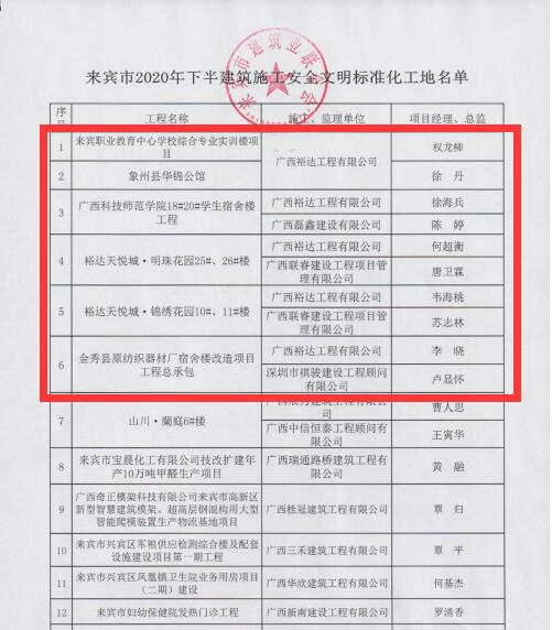 喜讯:裕达工程喜获6个来宾市下半年安全文明标准化工地及7个来宾市建设工程优质结构奖