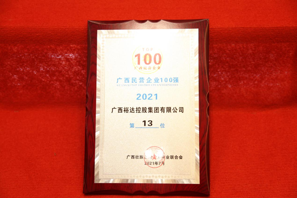 广西壮族自治区党委统战部副部长、自治区工商联党组书记卢能干表示:发布2021广西民营企业100强榜单,是为了总结成绩、比较发展、树立榜样,进一步引导、激励、促进广西民营企业健康发展。会上发布了《2021广西民营企业100强调研分析报告》,公布了2021广西民营企业100强、制造业100强、2021广西民营企业纳税10强、最具竞争力、最具潜力民营企业榜单。并为入围企业颁发荣誉证书进行表彰,裕达控股集团以803126万元的营业收入荣获2021年广西民营企业第13强!