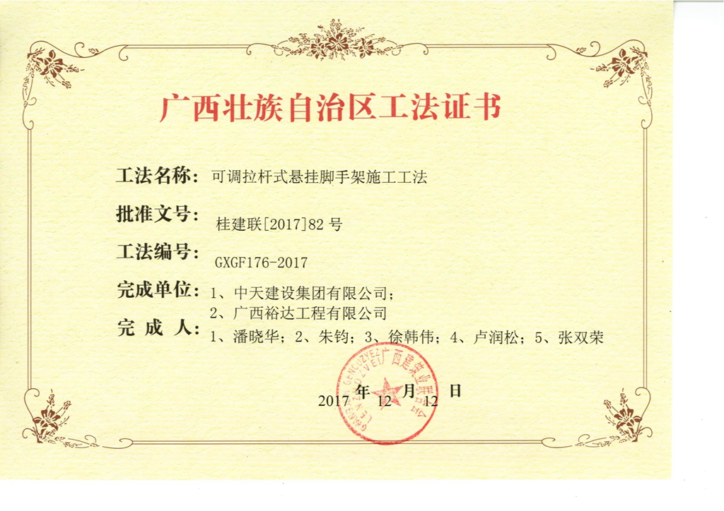 2017年广西壮族自治区工法证书(可调节杆式悬挂脚手架施工工法证书)